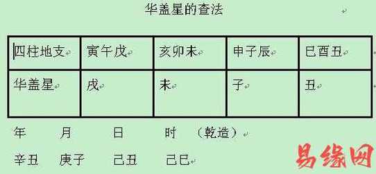 根据天干地支:华盖星在天干地支中分别对应不同的星君。在天干中,华盖星对应的是“壬”和“癸”;在地支中,华盖星对应的是“戌”和“亥”。如果一个人的八字中包含这些天干地支,则说明其八字带华盖。